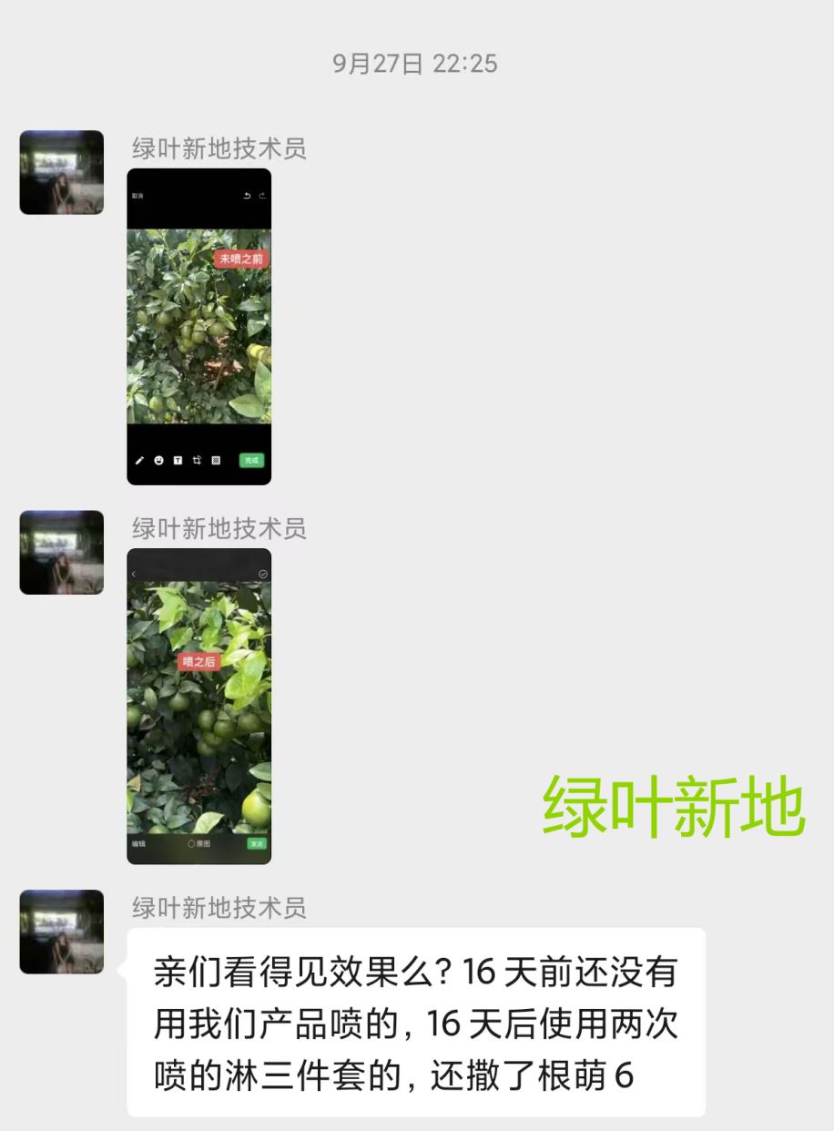 通过16天叶面喷两次蓝叶加果润,水淋三件套(绿叶根萌2+绿叶萌根+富和1)及时补充全面营养,快速激活根系吸收营养,恢复树体活力,叶片变厚绿、果实膨大了一圈,根部还撒了有机肥绿叶根萌6,改良土壤,增强抗逆性。