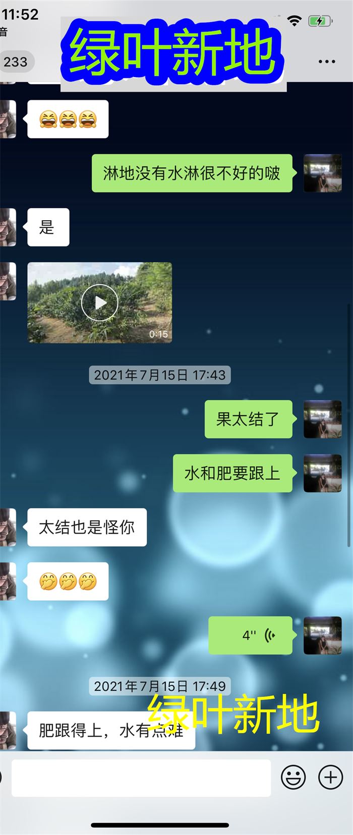 7月24日,潘姐发来家里的果树挂果图片,用了绿叶新地技术方案后,家里的酸柑兜砂糖橘挂满了串串果,还开玩笑说今年结果太多了都怪你“绿叶新地”。