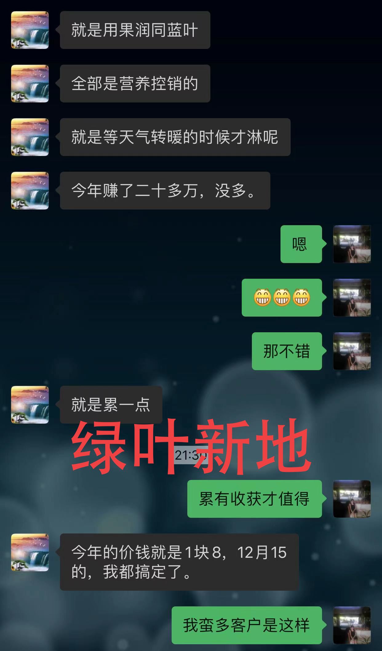 能有如此好的成效,离不开老板的细心管理,同样也离不开绿叶新地技术团队的技术服务,根据不同占木、树况、品种都会给出不同的方案。 不少客户都直接回购,以及买完对比完又回购的。可以为农创造价值的技术方案以及好的产品,永远都是有市场的。