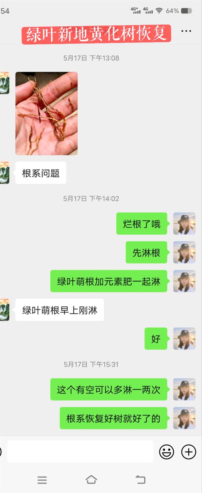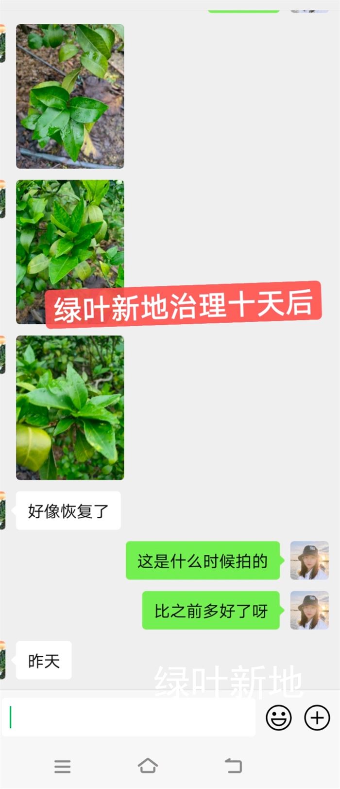 梁老板怀着死马当活马医的心态,接受了绿叶新地技术员给的方案。十天后,梁老板给绿叶新地技术员发来了最新黄化树的照片,还挺欣慰地说果树好像恢复了呢!