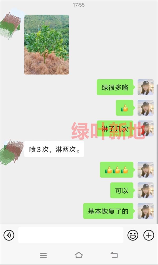 冯叔叔听取了绿叶新地技术员的建议,照着实行。一个月后,冯叔叔给绿叶新地技术员发来了果树治理后的照片。一看,叔叔家上次黄化的果树恢复得很好了,果树叶片都绿油油的了,叶片油亮反光。除此之外,果树长了不少新芽,新芽也是很健康。冯叔叔说,他淋了两次绿叶萌根加复合肥,叶面喷了三次蓝叶和芸苔素。